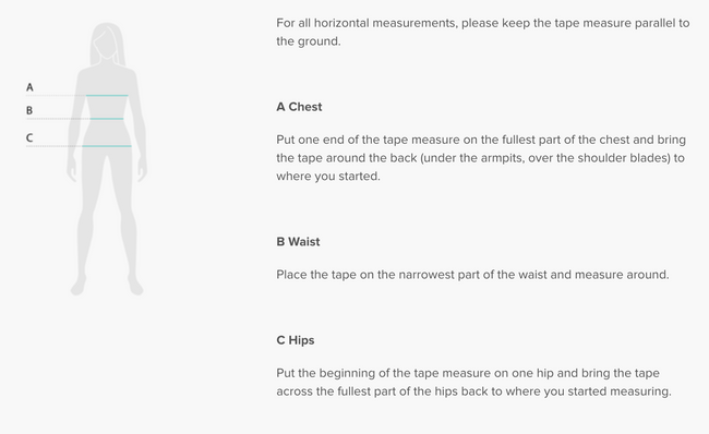 Record your body measurements for each dimension, then compare to the sizing chart. We suggest ordering a size up when your measurements are between sizes.