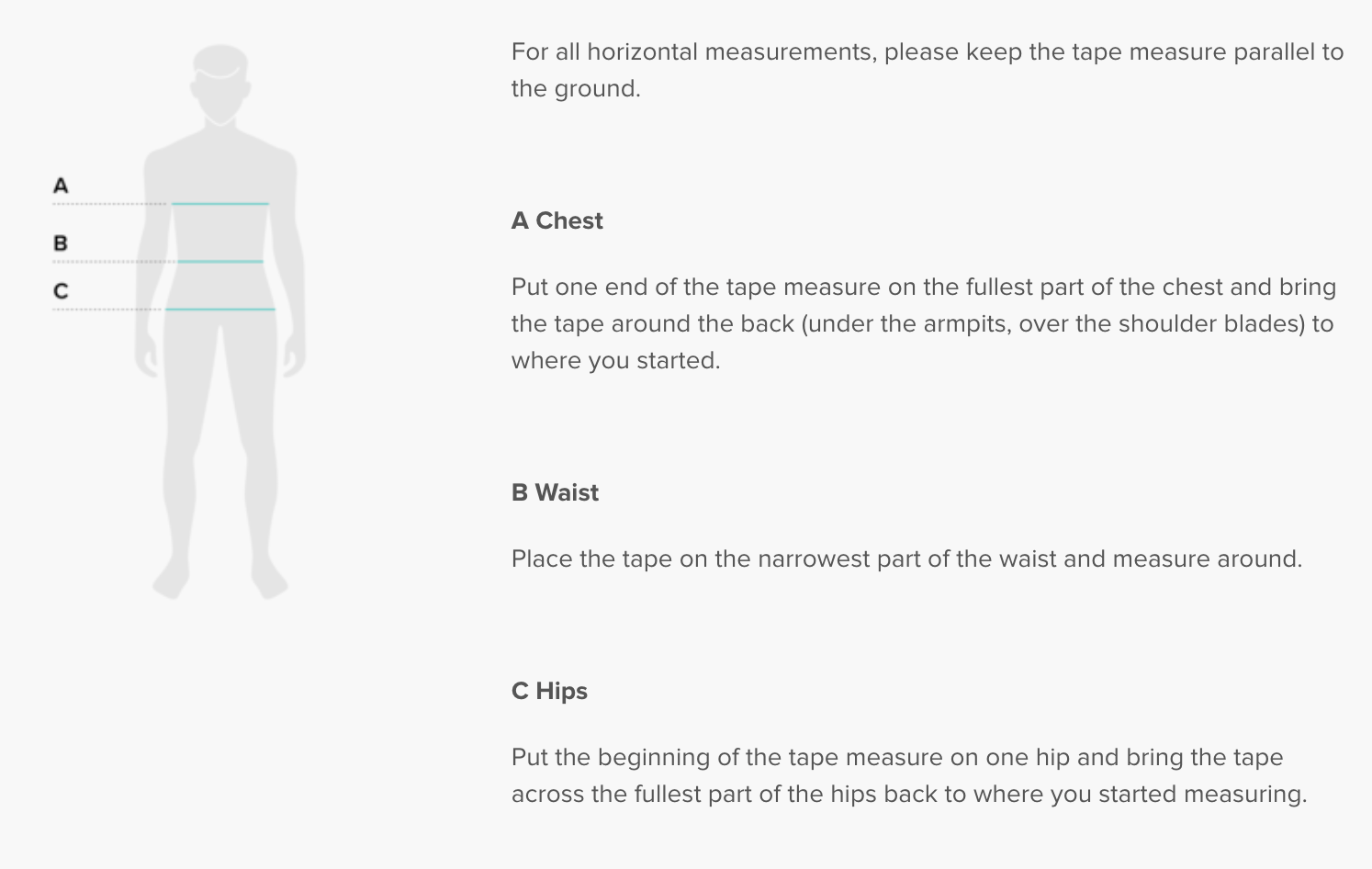 Record your body measurements for each dimension, then compare to the sizing chart. We suggest ordering a size up when your measurements are between sizes.