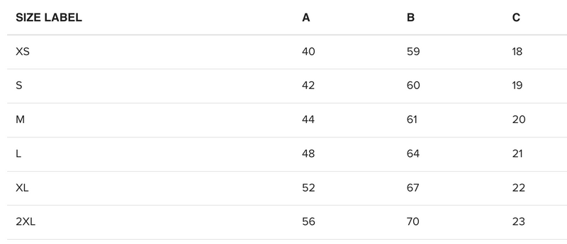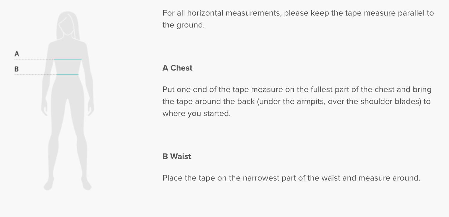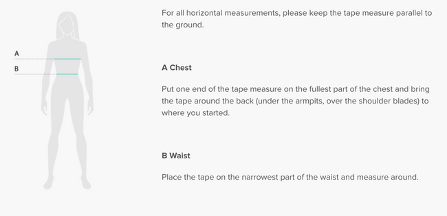 Record your body measurements for each dimension, then compare to the sizing chart. We suggest ordering a size up when your measurements are between sizes.